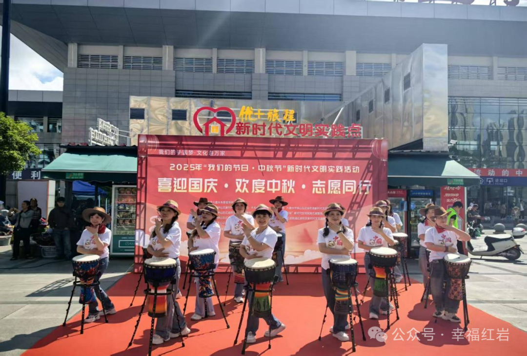 9月28日,红岩街道新时代文明实践所组织龙塘社区、水西社区、红岩社区、六盘水市爱心协会在六盘水火车站站前广场“优+旅程”新时代文明实践点举办了“我们的节日·中秋节”新时代文明实践活动暨“喜迎国庆·欢度中秋·志愿同行”文化活动。活动在激昂的手鼓舞表演中拉开帷幕,伴随着欢快节奏,将节日的喜悦传递给在场每一位居民,赢得阵阵掌声 。随后,古筝演奏者指尖轻拨,《我爱你,中国》经典曲目悠扬响起,传统乐器的独特韵味与双节主题完美融合,让居民沉浸式感受传统文化与家国情怀的碰撞。