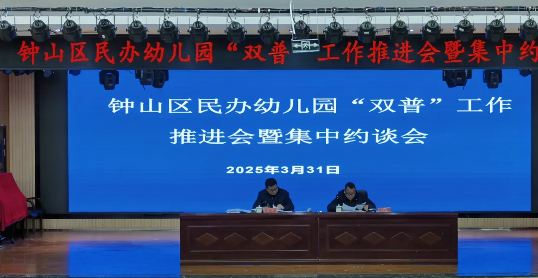 为贯彻落实国家关于学前教育事业发展的决策部署,全力推进钟山区学前教育普及普惠县创建工作。3月31日,钟山区民办幼儿园“双普”工作推进会暨集中约谈会召开。区教育局主要及分管领导、相关股室负责人,各中心校校长和学前教研责任区负责人,各中心园园长以及民办幼儿园举办者和园长等260余人参加会议。