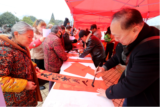 (书法老师正在为群众书写“福”字)