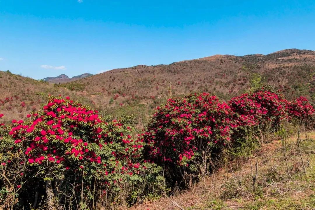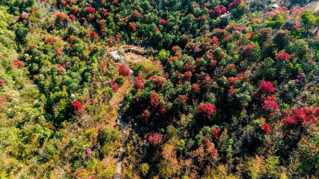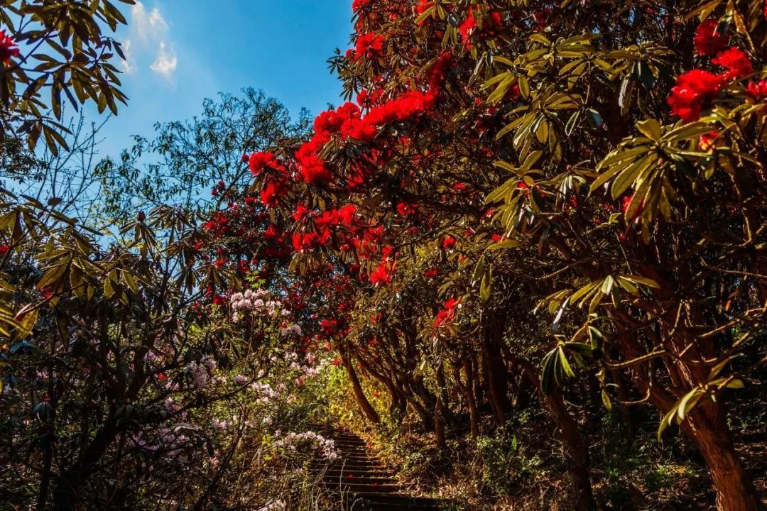 沿着青石步道深入山间,野生杜鹃正悄然绽放。浅粉的露珠杜鹃依偎着岩壁,暗红的马缨杜鹃在松林间探头,无需刻意寻找,转角处便有惊喜撞进眼帘。山间薄雾裹着花香,鸟鸣与风声相伴,坐在观景台的木椅上,可看日出、日落,看远处的村落炊烟袅袅,感受这份质朴的野趣与宁静。